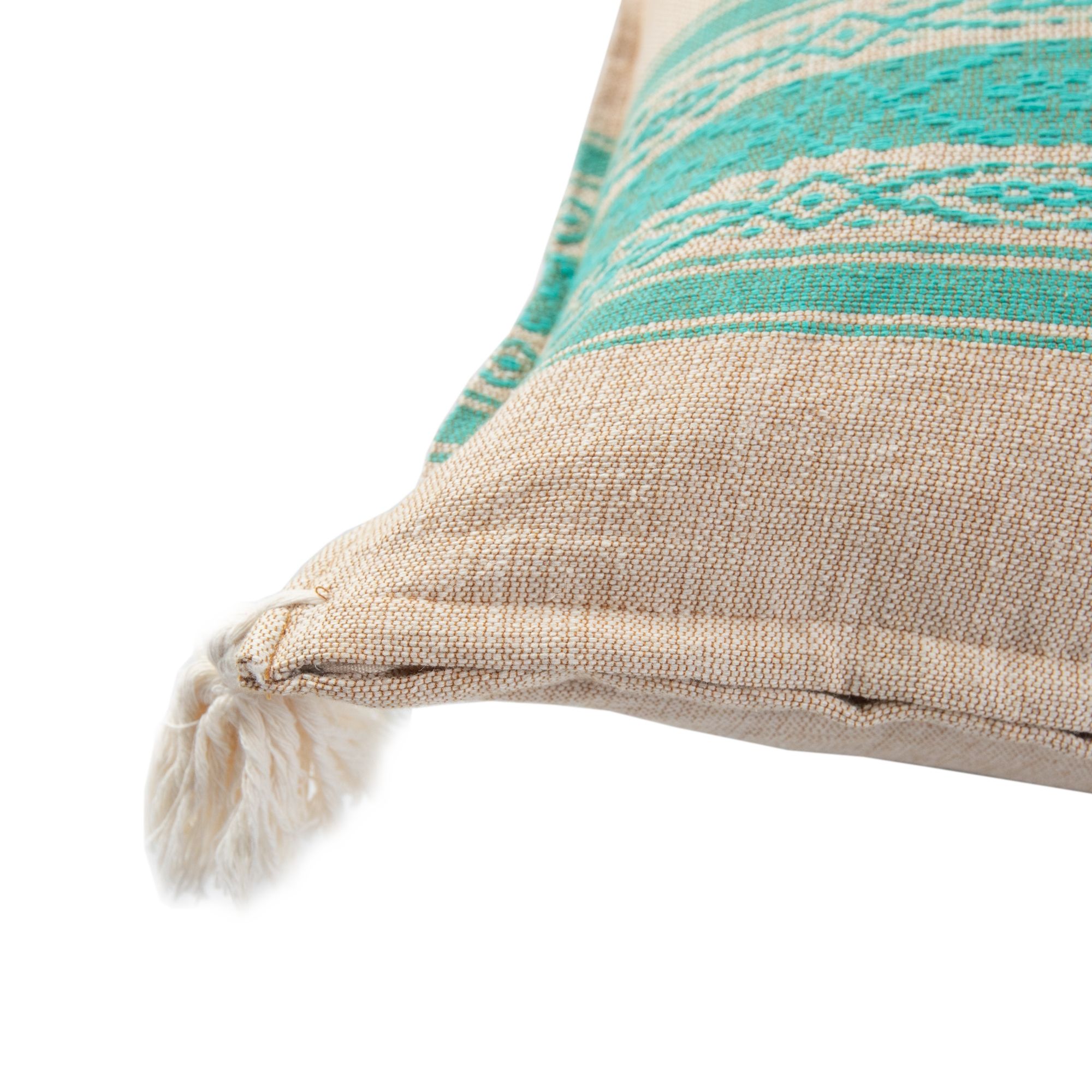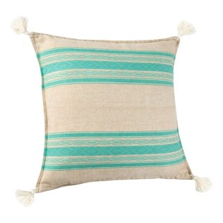 Beige Cushion with Green Lines and White Tassels